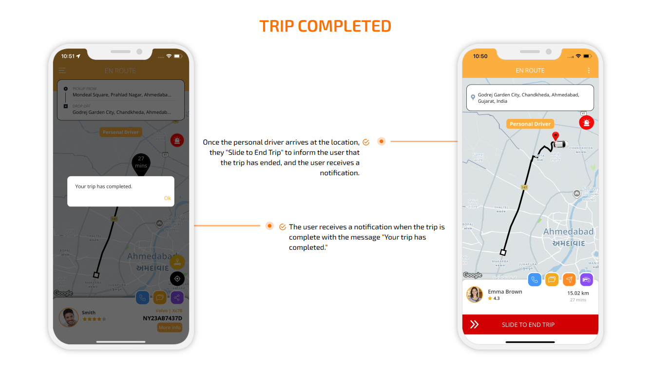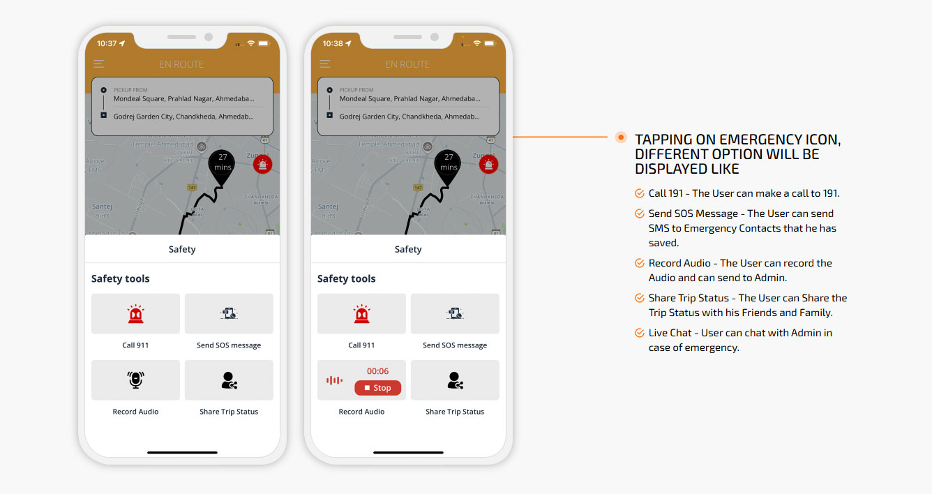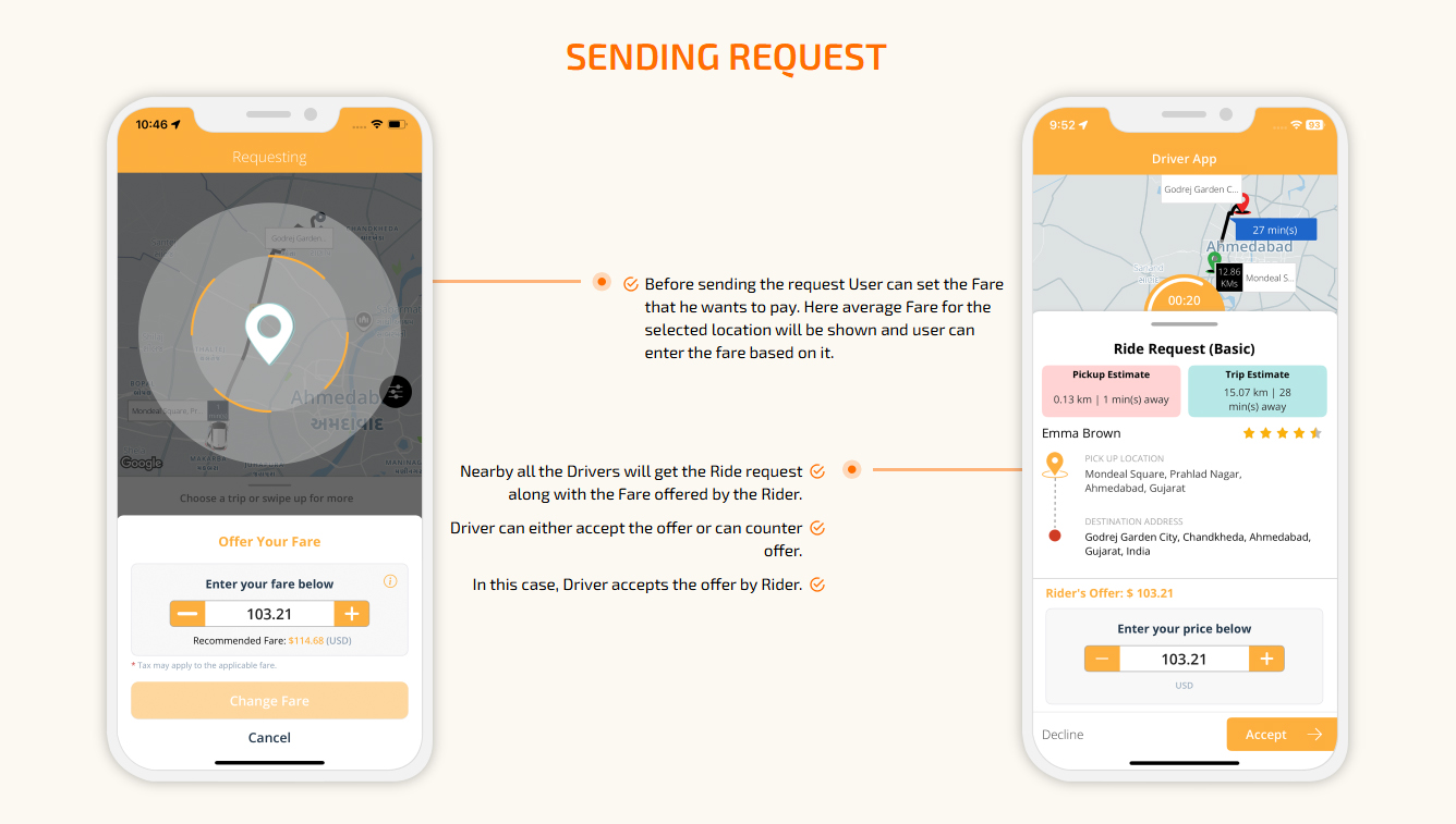 Step by step flow of communication between Rider and Driver starting from Registration - Login, Face Verification, Mobile Verification, Booking/Requesting ride by Passenger, Accepting ride request by Driver, Getting Payment options - Credit Card, Wallet or Cash, Fare Estimator, Driving arriving at pickup Location, In-app Notifications, Starting Ride, Travelling to Destination in Taxi, Ride Cancellation, Panic/Emergency Features, Completing Ride, Payments, Review & Rating Ride, Tipping, Ride History, Viewing Invoices, etc.