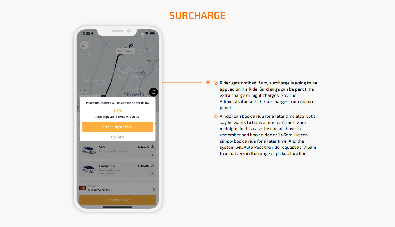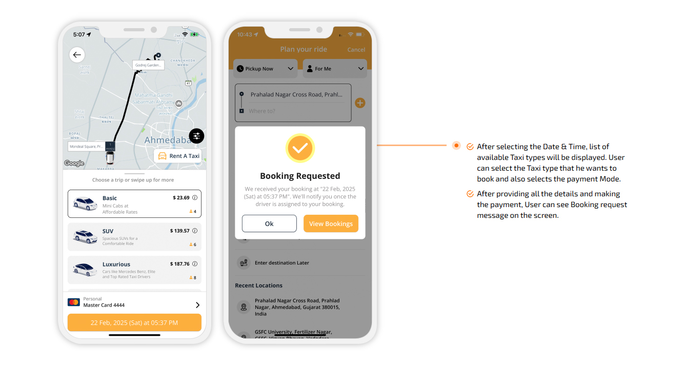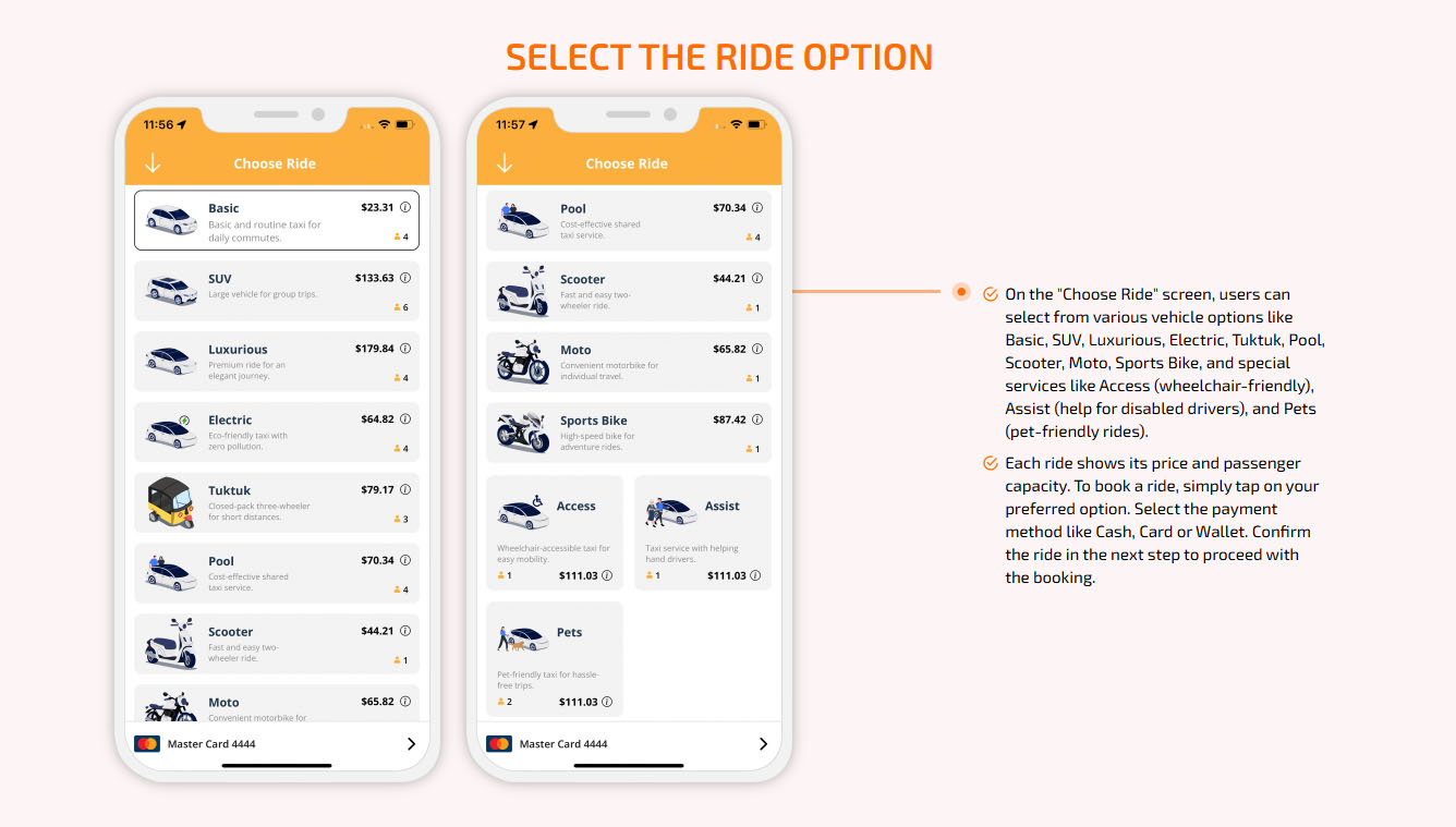 And additional features like Ride Later, Edit Profile, Inviting Friends, Wallet, Viewing About Us, Help Content, Contact Us, etc