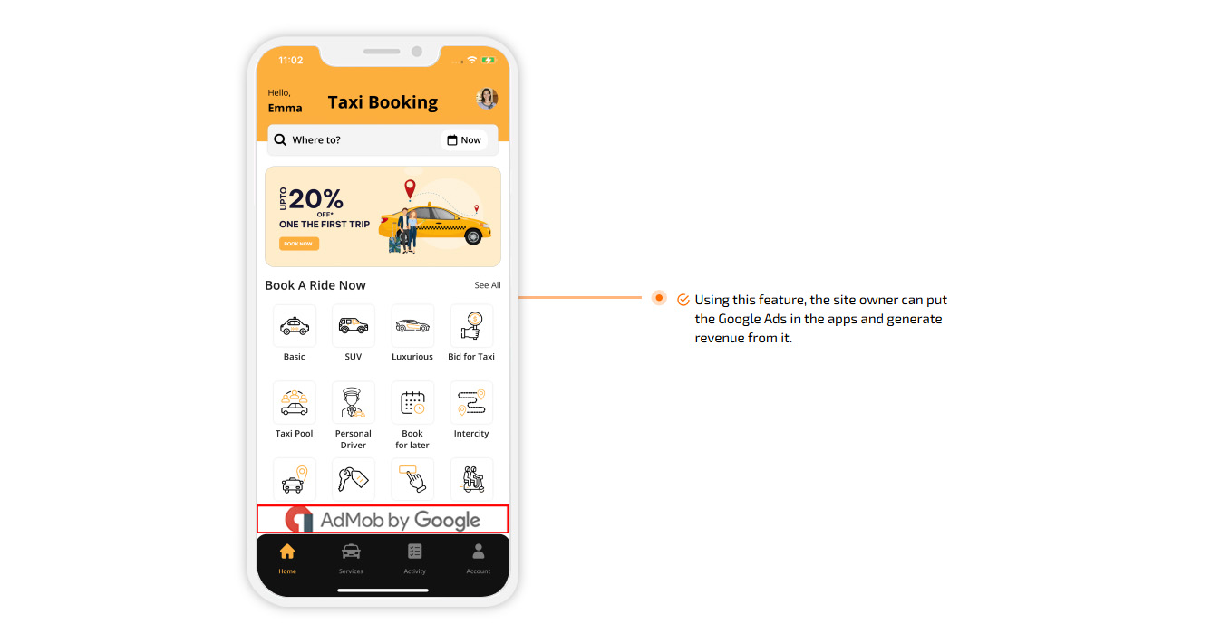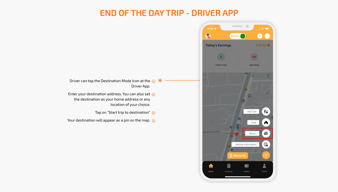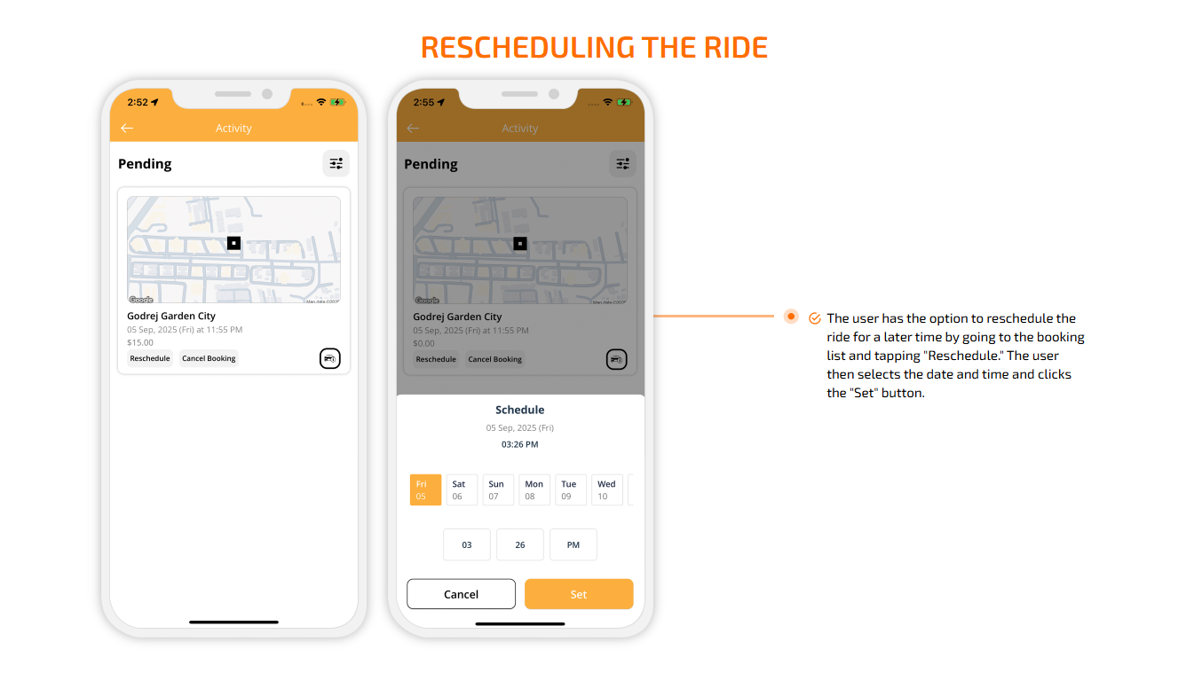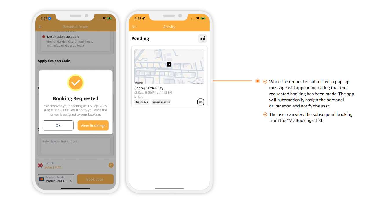 And additional features like Ride Later, Edit Profile, Inviting Friends, Wallet, Viewing About Us, Help Content, Contact Us, etc